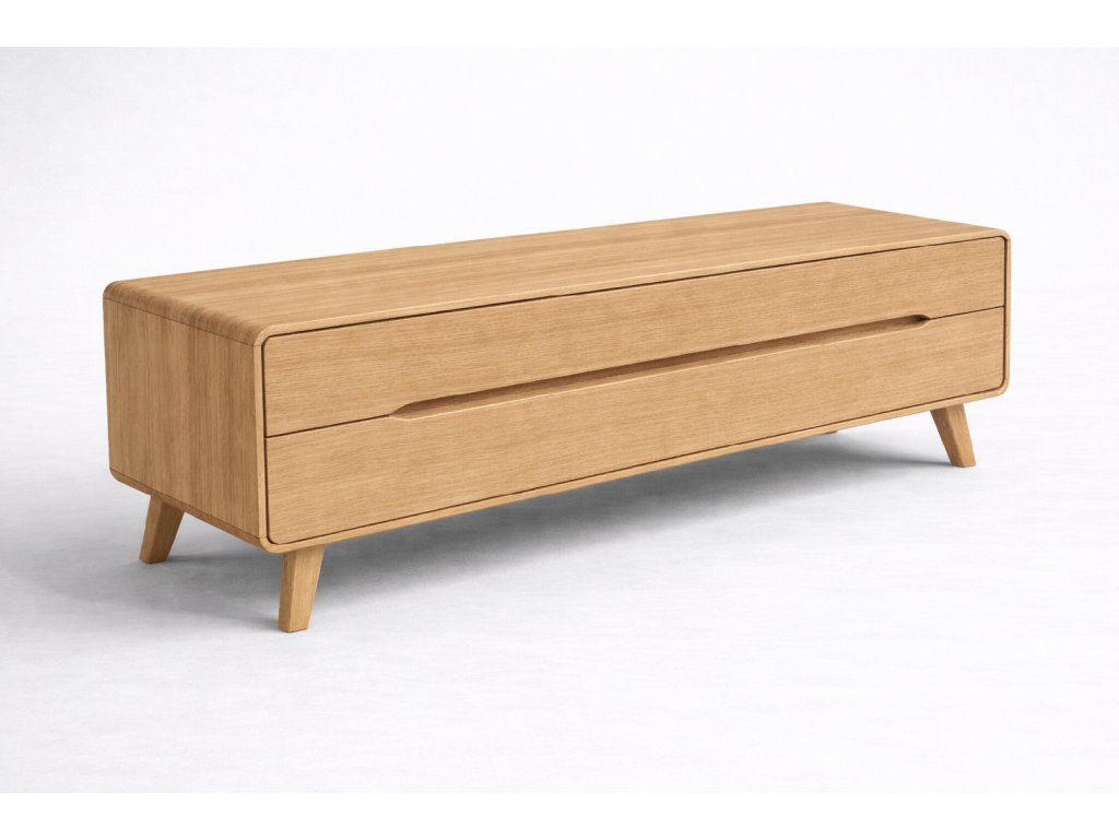 Zaoblené rohy a jemné línie vizuálne zjemňujú celkový tvar komody, vďaka čomu pôsobí príjemne a harmonicky v akomkoľvek priestore. Dva praktické zásuvky so zafrézovanými madlami ponúkajú elegantné a ergonomické riešenie bez rušivých prvkov. Komoda stojí na pevných drevených nožičkách, ktoré dodávajú celku ľahkosť a zároveň uľahčujú upratovanie pod nábytkom.