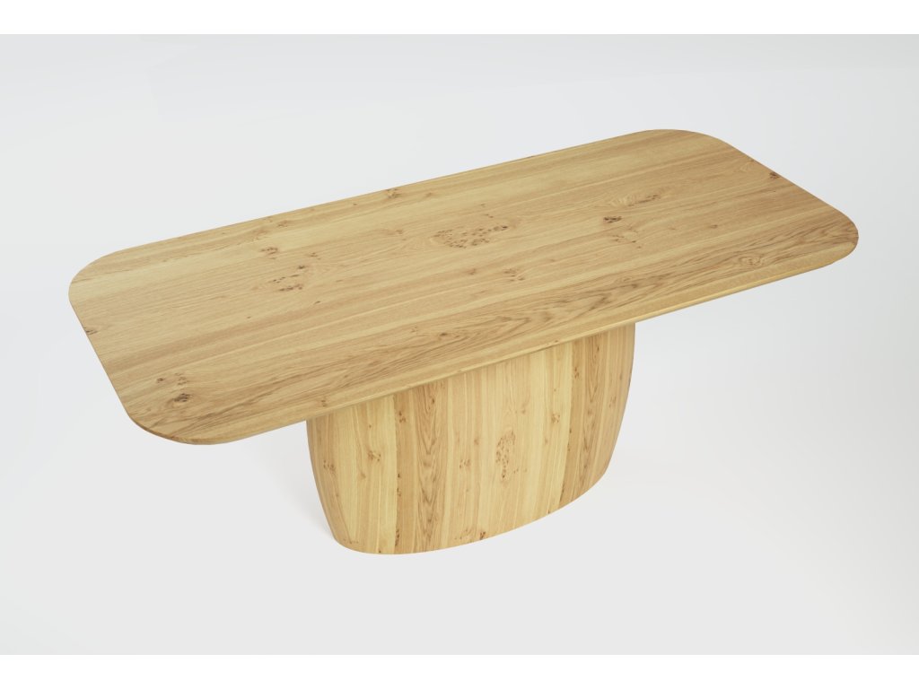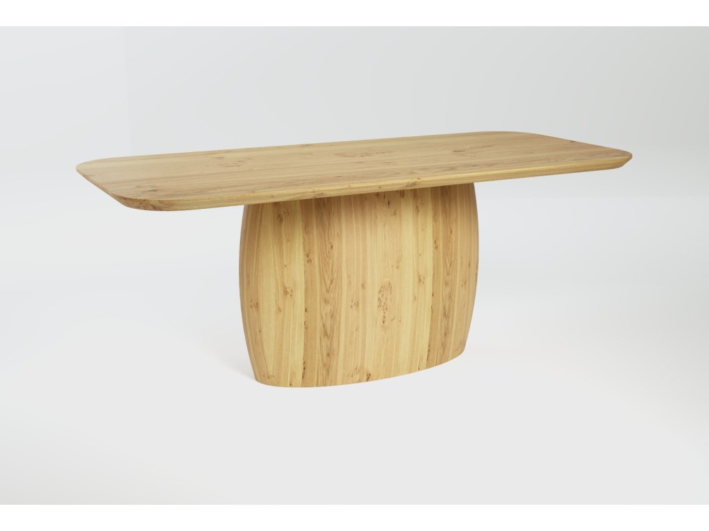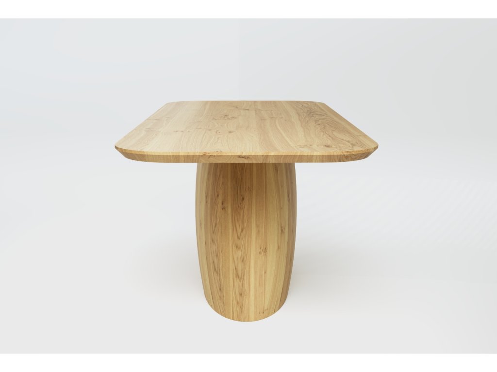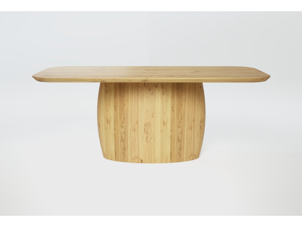 Celodrevená podnož a stolová doska spolu vytvárajú harmonickú súhru proporcií. Kontrast medzi tenkou, precízne tvarovanou líniou stolovej dosky a masívnou stolovou nohou dodáva modelu DARON výrazný architektonický charakter. Tento balans medzi ľahkosťou a silou robí zo stola nadčasový dizajnový prvok.