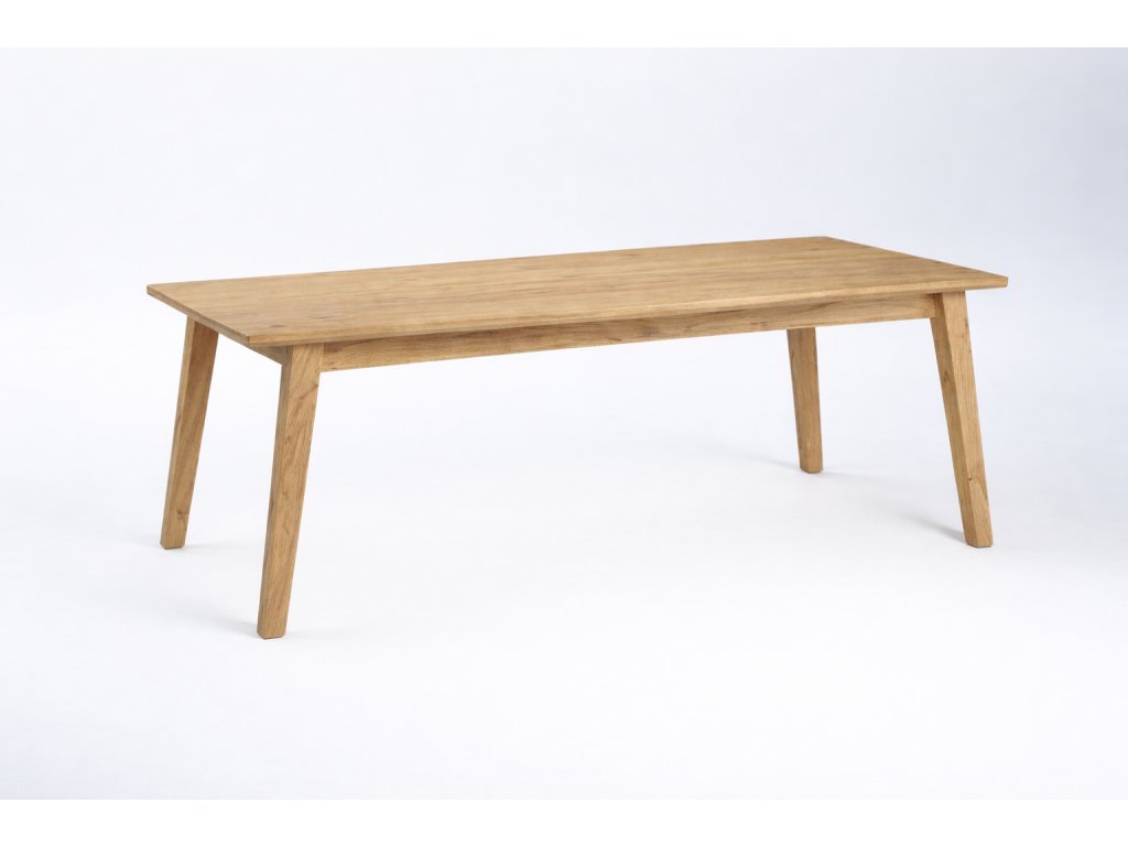 Minimalistická slim konštrukcia pôsobí elegantne a vzdušne, pričom si zachováva pevnosť a stabilitu masívneho dubu. Obdĺžniková stolová doska s jemne zaoblenými hranami zvýrazňuje prirodzenú kresbu dreva a dodáva interiéru teplo a charakter.