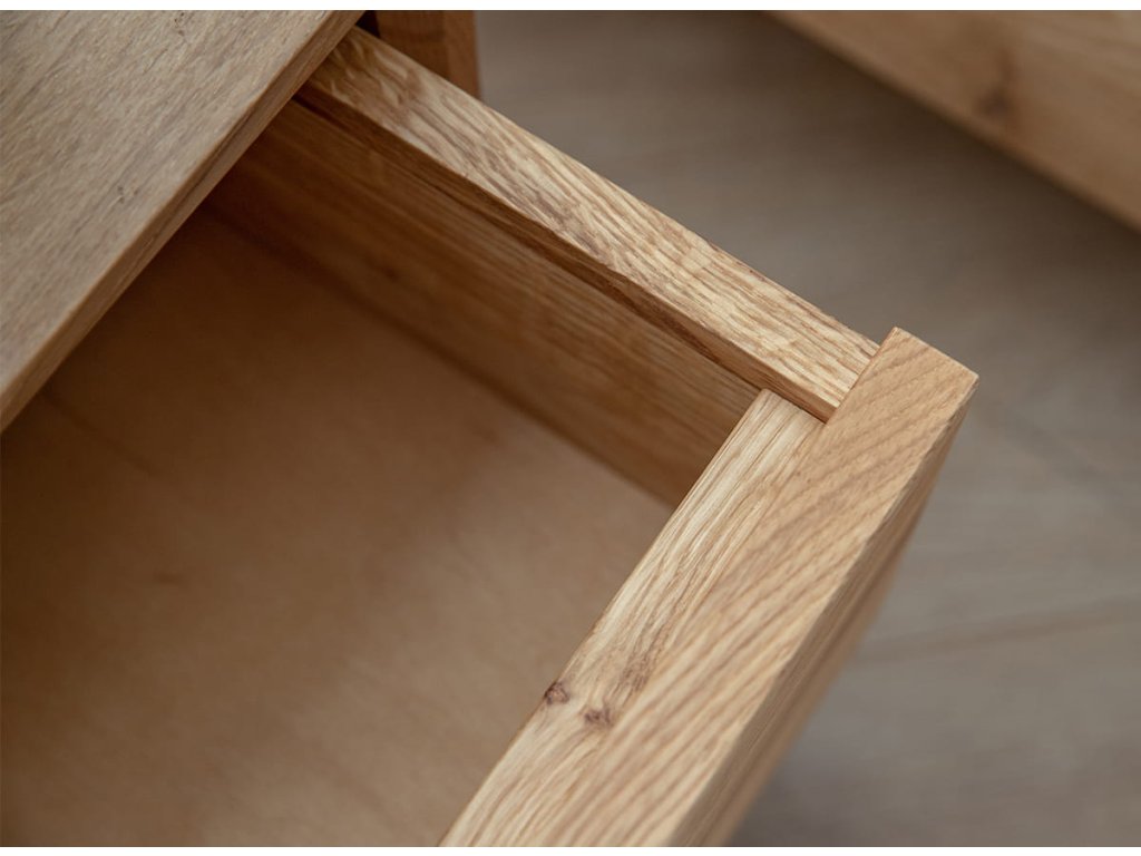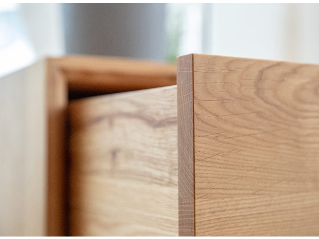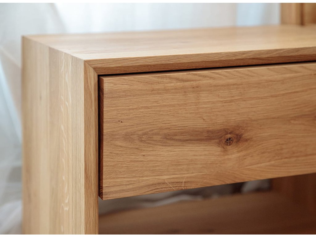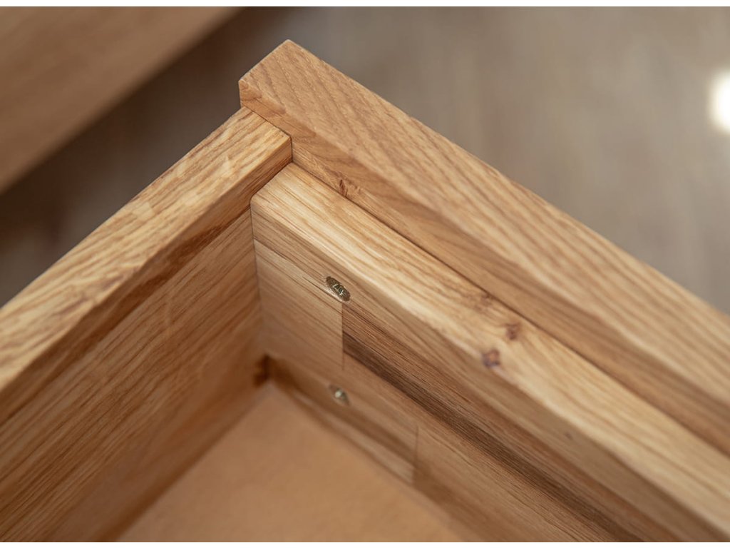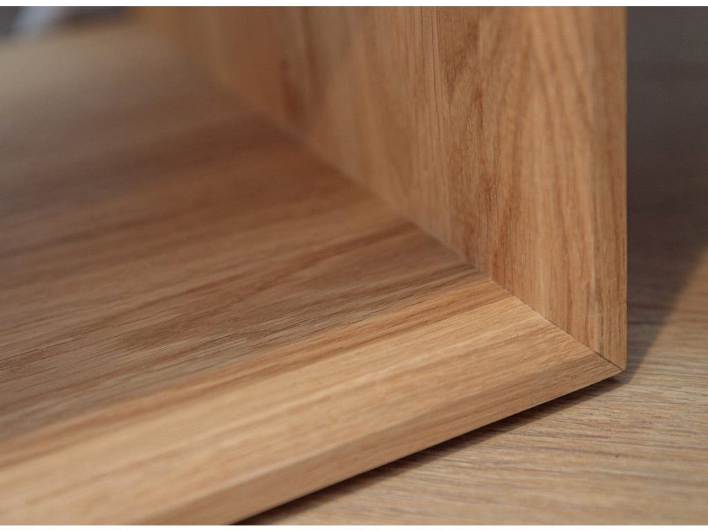 Stolík RIA 2 je vyrobený z masívneho dubového dreva a ošetrený olejom, ktorý chráni povrch pred poškodením a zároveň zvýrazňuje prirodzenú krásu materiálu. Dub je známy svojou pevnosťou a odolnosťou, takže stolík si zachová svoj vzhľad po mnoho rokov. Každý kus je originál s jedinečnou kresbou dreva. Nábytok je pripravený na okamžité použitie bez potreby montáže. Praktický systém tip-on zvyšuje komfort pri každodennom používaní.